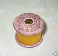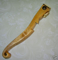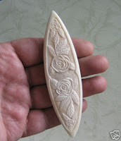 Dave has hand carved Hitty this footstool with her initials "H.P." with a rose and leaf motif. The upper foot rest is bone, and the base is carved from elk antler. This beautiful footstool measures 2 5/8 inches long by 1 inch wide, and stands 3/4 inches high.